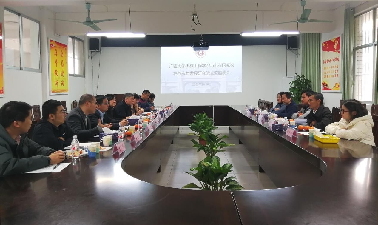 老挝国家农林研究院园艺研究所副所长Bounpheng Sihomchanh先生、中国-老挝合作农作物优良品种试验站副站长兼老挝国家农林与农村发展研究院水果与蔬菜研究中心副处长Bounsavath Phongdara先生,南宁国际商会副会长冼宜艺,中国─马来西亚蓝德环境科技集团股份有限公司副总经理冯石平等一行5人,与威尼斯vip官网党委书记卢婵江、副院长黄豪中、莫帅,农机专家团队蒙艳玫、杨望教授等在会上交流,深化中国与老挝在农林机械领域的交流与合作,共同探索适应老挝农业发展需求的农机技术与推广路径。