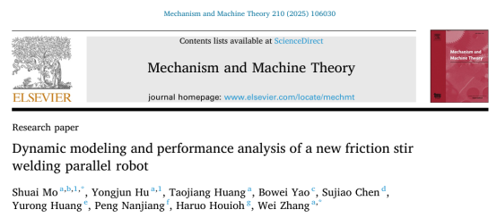 近日,威尼斯vip官网2023级硕士研究生胡勇军(导师:莫帅教授)以共同第一作者在机械领域国际权威学术期刊《Mechanism and Machine Theory》(中科院一区,Top期刊)发表研究成果“Dynamic modeling and performance analysis of a new friction stir welding parallel robot”。该成果以3200威尼斯vip为第一单位及通讯单位。
