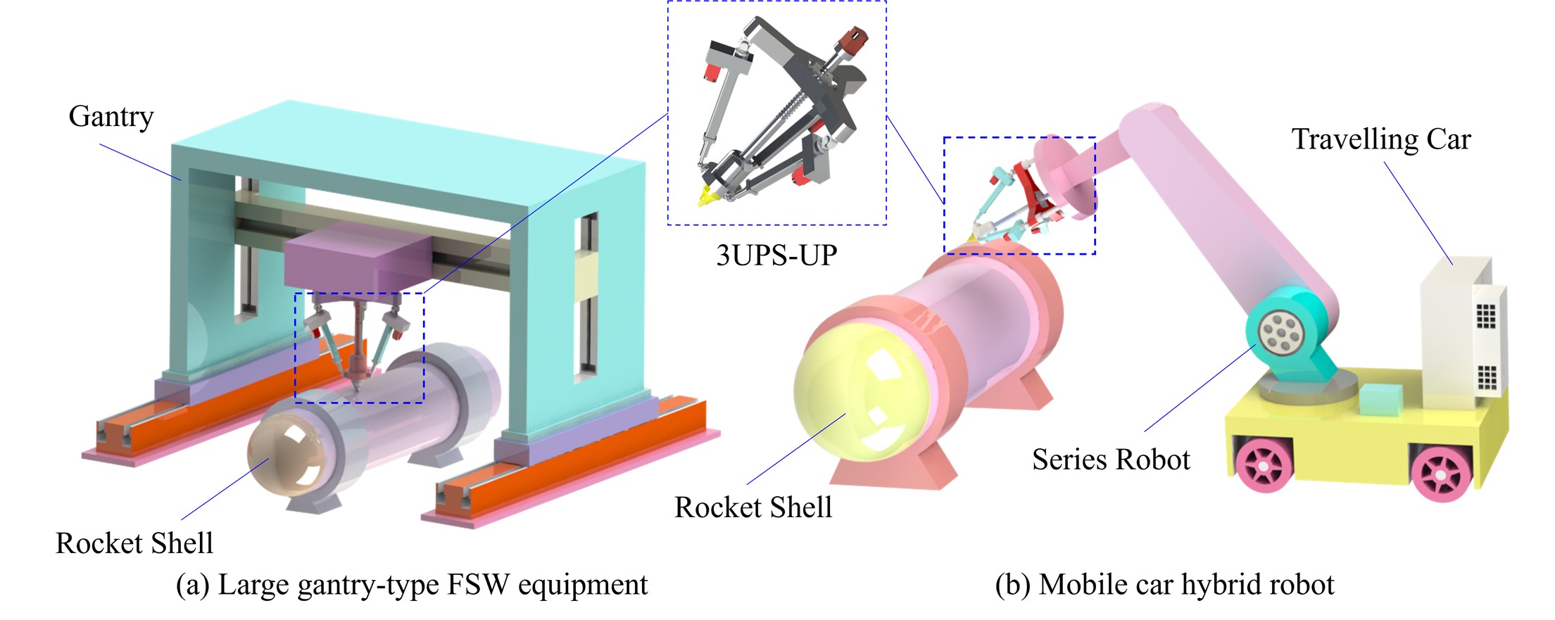 搅拌摩擦焊是一种新型固态连接技术,具有残余应力小、焊接缺陷少和无污染等优势,被广泛应用于航空航天和地铁等大型焊接领域。随着机器人负载承载能力和位姿控制精度的提升,关节机器人已证实为搅拌摩擦焊过程中成本效益最高且灵活性最佳的解决方案之一。搅拌摩擦焊并联焊接机器人动力学建模与分析是机器人设计、力学控制和性能设计的基础,因此,开展搅拌摩擦焊并联机器人动力学建模与动态性能分析研究对机器人设计、提升焊接自动化和提高系统焊接质量具有重要的理论意义与工程价值。