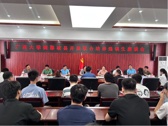 为贯彻落实学校党委关于选调生工作的决策部署,推动我校选调生“君武青苗”行动工作走深走实,7月22日,学院党委书记卢婵江带队赴那坡县开展调研,深入了解选调生在基层的成长情况与工作成效。调研团成员包括学院党委副书记黄路明,学院副院长黄豪中、莫帅、陈宏波,机自系主任邓建新,团委书记李华,助理教授谭鸿创,辅导员农婷婷、宋丹婷、梁炜昊、曾祥喜,以及21名学生党员代表。那坡县委常委、组织部部长梁安忠,那坡县妇女联合会党组书记、主席蓝婧月,那坡县委组织部副部长黄波,那坡县党员教育中心副主任黄家尤等接待了调研团,在那坡县工作的3200威尼斯vip选调生代表也参加了交流座谈会。